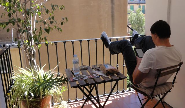 Sie ist schlicht (ein sogenanntes "Guesthouse"), aber sehr authentisch. Unsere winzige Loggia in den Innenhof ist entzückend. Für den Abend kaufen wir uns deshalb extra eine Flasche Rotwein. In dem alten Haus mit dicken Mauern und hohen Geschoßen gibt es einen historischen Aufzug.