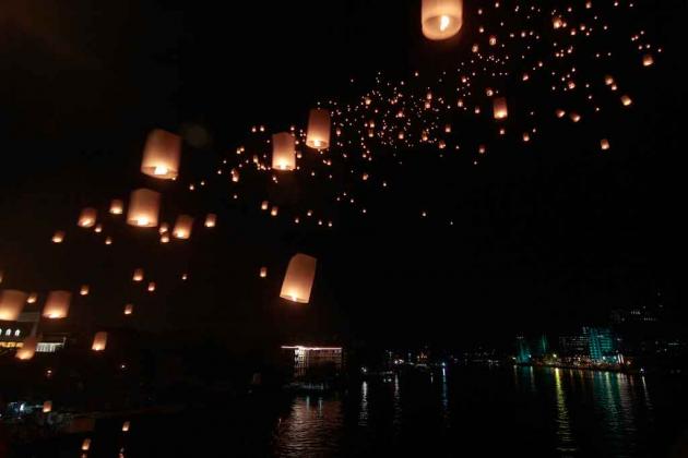 Am Himmel über dem Meer schwebten hunderte rote und weiße Papierlaternen.