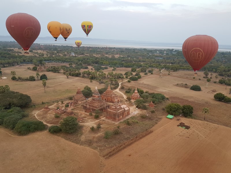 Vier Tage später gehts zur nächsten Station, Bagan. Über 2000 historische Pagoden sind dort auf einer überschaubaren Fläche verteilt. Ein eBike (Elektromoped) ist hier das typische Fortbewegungsmittel. Wir machen zuerst eine geführte Tour um die Gegend kennenzulernen, und mieten dann noch mal ein eBike um auf eigene Faust herumzufahren. Letzter Tag. Es ist Silvester in Wien, hier ist es 5:30 morgens, und wir finden uns am Treffpunkt zur Ballonfahrt ein. Schon die Vorbereitung ist beeindruckend. Es ist für uns beide die erste Ballonfahrt, und wir staunen über den routinierten Ablauf. Alles ist bis ins Detail durchgeplant. Wir empfinden kein bisschen Angst, nur Freude und Staunen. Viel zu schnell ist alles vorbei und wir haben eine sanfte Landung.