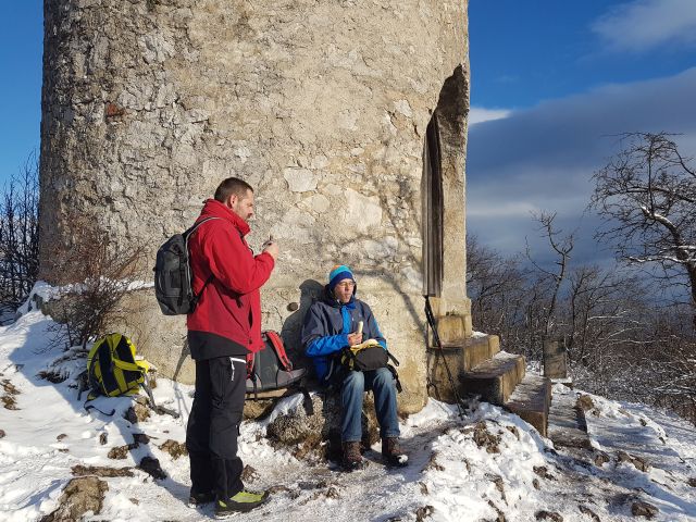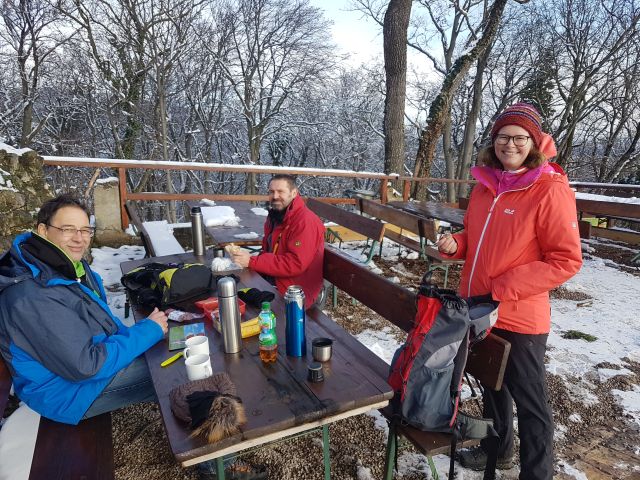 Weiter gehts zuerst in einen Graben (hier der erwähnte Misstrauensantrag an Andreas...) und dann lange und steil bergauf zur Wilhelmswarte am Anninger. Ziemlich windig da oben, aber wunderschöne Weitsicht!