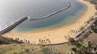 Eine schöne, einsame Wanderung. Kaum beschildert, aber wir haben die GPS Daten. Ein deutsches Ehepaar fragt uns auf halber Strecke verzweifelt nach dem Weg, nachdem sie bereits zwei Stunden herumirren, und dabei in die unwegsamen Felsen gekommen sind. Scheinbar vertrauen sie uns aber ncht und gehen lieber am selben Weg zurück, als weitere Irrwege zu riskieren. Davon gibts genügend hier, doch wir navigieren mit dem Handy wohlbehalten ans Ziel. Sehr außergewöhnlich sind hier die brüchigen Steine, die bei Berührung in fliesenähnliche Platten zerfallen. Teresita soll der schönste Strand der Insel sein, und das deshalb, weil viele Tonnen weißer Sand aus Afrika angekarrt wurden. |