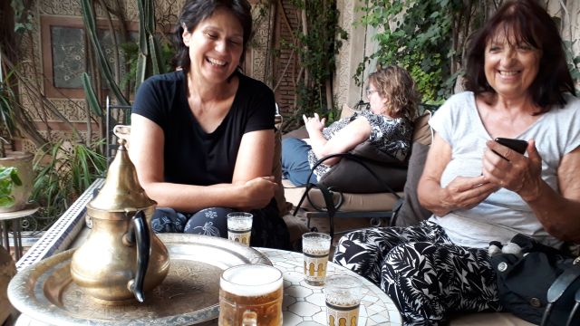 Dann haben wir Hunger. Wieder betreten wir ein eher unscheinbares Haus und werden über mehrere Etagen auf eine gedeckte Terrasse geführt. Wir fühlen uns orientalisch. Der marokkanische Tee ist uns inzwischen eine Selbstverständlichkeit. Es gibt aber auch Bier. Alkohol ist in Marokko verboten, den bekommen nur Touristen und das nur in speziellen Restaurants, die dafür eine Genehmigung haben. Zum Essen kann man aus verschiedenen Tajines wählen. Mit und ohne Couscous. Die Fleischbeilagen sind Hendl, Rind oder Lamm und viel Gemüse. Die Rüben und Zucchinis sind dabei in ihrer natürlichen Größe belassen. Eine Tajine ist ein besonderes irdenes Geschirr, in dem die Tajine gekocht und auch gleich serviert wird. Das hält das Essen lange warm.