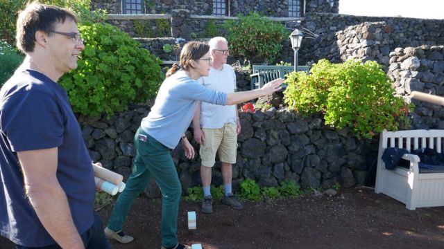 Zur Entspannung spielen wir gemeinsam Kubb und Boule.