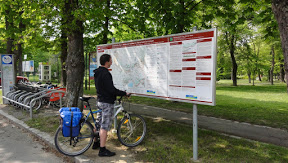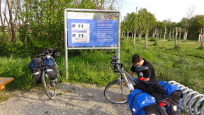 Nach dem Frühstück gehts los, weiter entlang des Marchfeldkanals. Dann münden wir erneut in einen altbekannten Weg, den Donauradweg kurz vor Bad Deutsch Altenburg. Nach der Donaubrücke eine kurzfristige Planänderung: auf einer Tafel entdecken wir den Römer-Tour-Radweg, der Richtung Neusiedlersee führt. Den kennen wir noch nicht, los gehts! Reine Genußtour, zwischen Feldern und Windrädern. Das Parndorfer Outletcenter kennen wir jetzt auch gut, denn der Radweg führt auf verschlungenen Wegen mittendurch. Wir widerstehen dem Drang zum Shoppen, der bei uns nur schwach ausgeprägt ist... und sind froh, wieder rauszukommen!