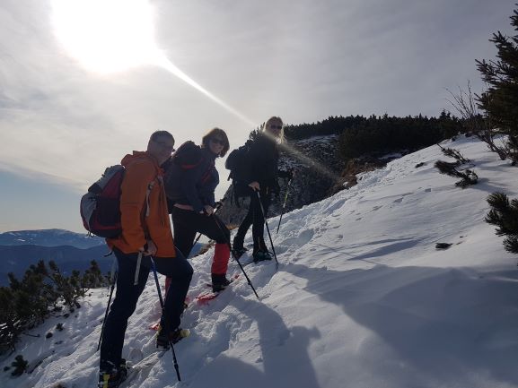 Die Bergstation ist belebt wie eine Schihütte. Wir wandern los Richtung Ottohaus, und entlang der Preiner Wand zur Seehütte. Hier trifft sich nur noch ein ausgewählter Kreis von Schneeschuh- und Spikewanderern.