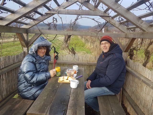 Für unsere Rast mit Punsch, Obst und Weihnachtskeksen finden wir ein schönes Plätzchen in den Weingärten. Schnell das Bänkchen gegen den Wind gestellt, und es ist schön kuschelig.